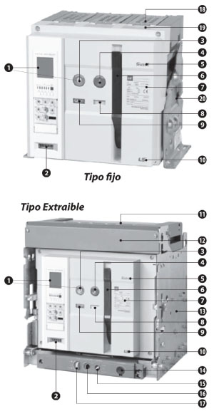 1. Relé de disparo; 2. Contador; 3. Bontón de encendido; 4. Botón de apagado; 5. Nombre serie; 6. Palanca de carga; 7. Placa identificatoria; 8. Indicador de carga/descarga; 9. Indicador de encendido/apagado; 10. Marca; 11. Cubierta arco; 12. Cubrecontactos; 13. Bandeja; 14. Manija de extracción; 15. Indicador de posición; 16. Manija para inserción; 17. Botón de bloqueo; 18. Cámara de extinción; 19. Cubierta de control; 20. Enganche tipo fijo Los ACB de LS Industrial Systems LBA son una solución para la conexión y protección de ramales en donde se necesita alta capacidad de corriente (desde 630 hasta 5.000 A), y una alta capacidad interruptiva (hasta 100 kA).