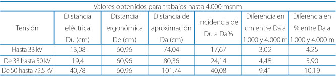 Si tenemos en cuenta que las variaciones con respecto a la altura serán del 10% cada 1.000 m, por encima de los 1.000 m, es decir que para una altura de 4.000 m dará como resultado, en el peor de los casos, una variación de la distancia eléctrica (Du) de un 30% tendremos una situación como la resumida en la tabla 2.