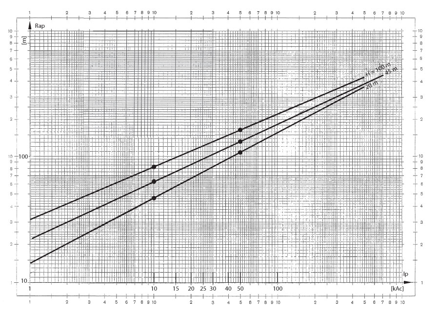 En la figura 4, representamos las dos funciones “Rap = F(H; Ip)”para corriente presunta Ip de 5 o 50 kAc como parámetros.