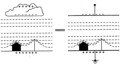 La figura A1 muestra los conceptos básicos del inicio de un rayo negativo descendente típico a tierra (aproximadamente, 90% de los casos). Se muestra la equivalencia aproximada entre el sistema de cargas nube-tierra y un capacitor. Se pueden observar las líneas de potencial deformadas por la presencia de los objetos terrestres, lo que provoca la intensificación del campo eléctrico creado por la nube tormentosa eléctrica.