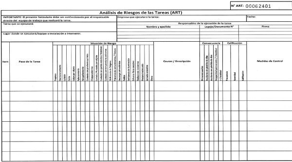Análisis de riesgos de las tareas (ART) donde se evalúa insitu las condiciones en que se va a evaluar la tarea.