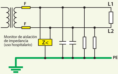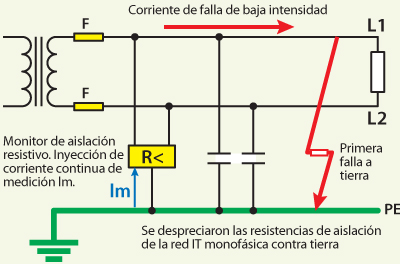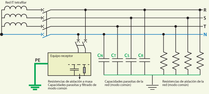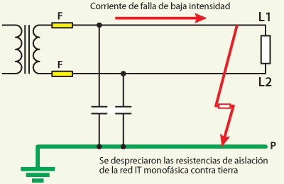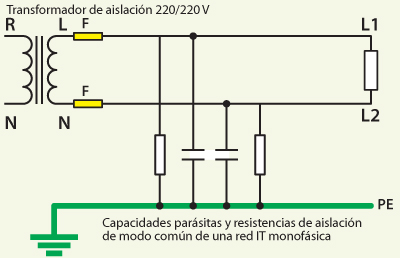 Para una red monofásica IT como la indicada en la figura 3, la red se vincula a tierra a través de las resistencias de aislación y capacitancias parásitas con respecto a tierra.