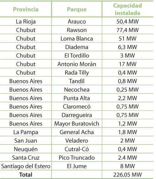 Argentina tiene instaladas diversas plantas de generación eólicas en todo el país, las cuales suman un total de 226,05 megawatts (ver tabla 2). Esto es el resultado de una larga historia de proyectos y leyes que aún se está escribiendo, y que se espera que crezca aún más, atendiendo a las bondades que presentan algunas regiones del país para aprovechas más este recurso.