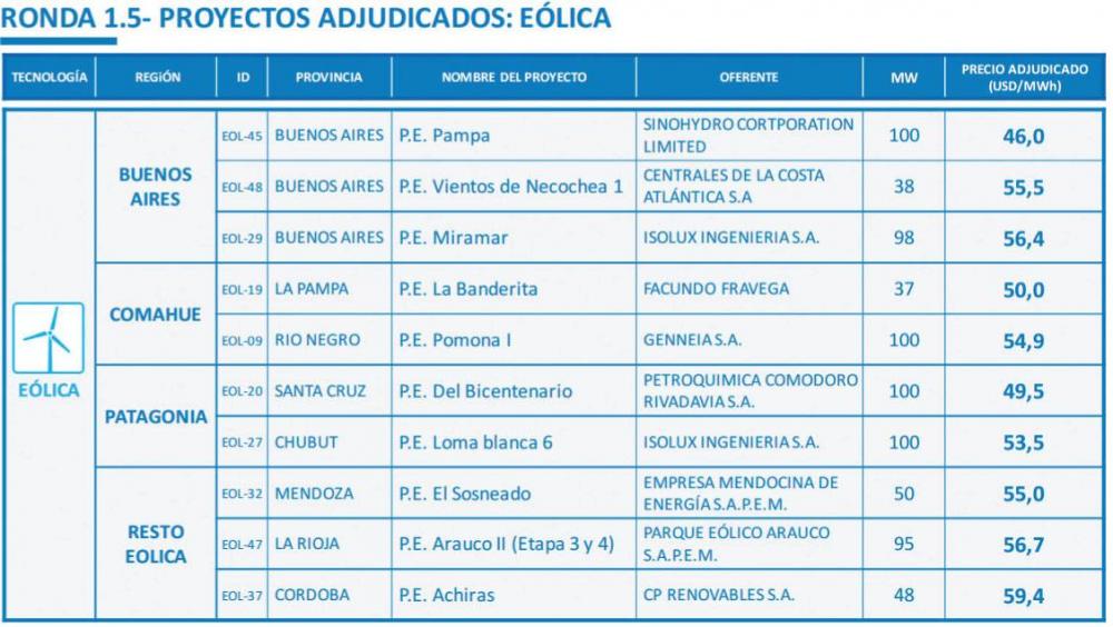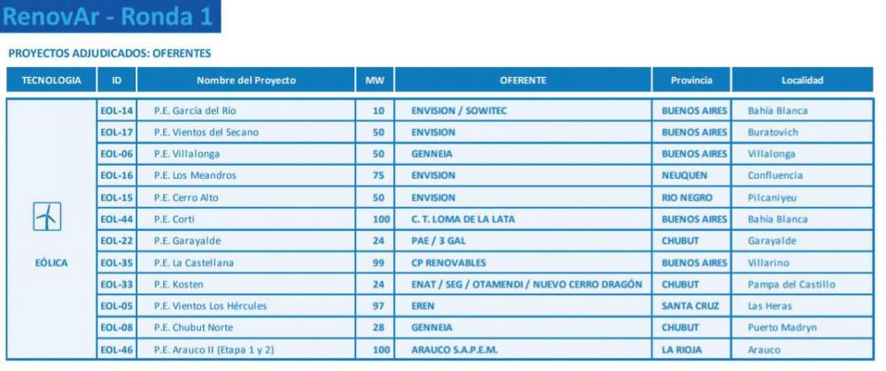Solo fue posible construir módulos estructurados financieramente en el mercado local, ya que ningún adjudicatario pudo obtener financiamiento en el mercado internacional. Setecientos cincuenta y ocho megawatts (758 MW) eólicos formalizaron un contrato, pero solo lograron su desarrollo los parques Rawson I (48,6 MW), Rawson II (28,8 MW) y Loma Blanca IV (51 MW). A los mencionados deben sumarse el Parque Eólico Arauco (50 MW) construido en tres etapas por contratación directa del gobierno de La Rioja con ENARSA.
