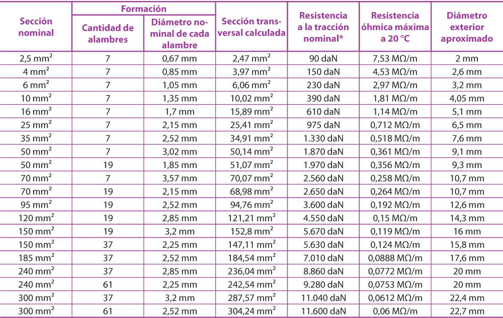 Tabla 2. Características dimensionales, mecánicas y eléctricas de conductores de cobre duro desnudos según IRAM 2004. Resistencia óhmica máxima a veinte grados, resistencia a la tracción nominal y diámetro exterior en función de la sección nominal. Conductores eléctricos de cobre duro desnudos para líneas aéreas de energía y puestas a tierra.