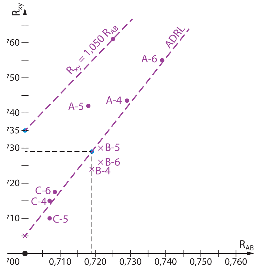 * Corresponde a la resistencia a la tracción calculada de la tabla III de la Norma IRAM 2004 con valores redondeados a 10 daN En la figura 2 se dibuja esta recta ADRL de las nueve muestras A4-6, B4-6 y C4-6. Se ven muy claramente las dispersiones de los puntos AI, BI y CI de (RAB, RXY) de cada muestra A, B y C.