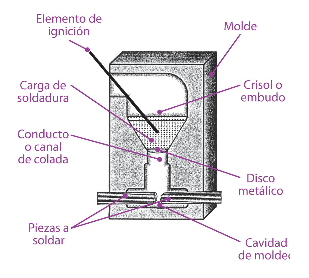 Soldadura cuproaluminotérmica. Proceso de soldadura por termofusión, donde el calor necesario se obtiene por el efecto reductor del aluminio sobre el óxido de cobre, que genera una reacción exotérmica de alta temperatura. El material de aporte es el cobre fundido y recalentado, resultante de dicha reacción termoquímica. (Ver figura A2).