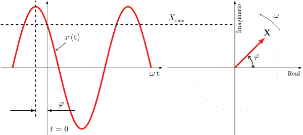 Palabras clave: Sincrofasores. PMU. GPS. Figura 1. Una sinusoide y su representación como un fasor, en donde x(t) representa una tensión o corriente de línea en función del tiempo. El ángulo de fase del fasor es arbitrario, ya que depende de la elección del instante t = 0. Obsérvese que la longitud del fasor es igual al valor RMS de la sinusoide.