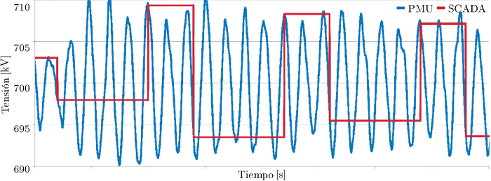 Esta norma también introduce una clasificación en función de las prestaciones de la PMU, que se divide en dos clases diferentes: la clase P, especialmente destinada a aplicaciones que requieren respuestas rápidas, como las de protección, y la clase M, que requiere mayor precisión para las aplicaciones de medición. Otro hito de estandarización importante lo da la norma IEEE C37.242, publicada en 2013, como una guía para la calibración, pruebas e instalación de PMU. Figura 2. Comparación de la respuesta dinámica de una PMU y un sistema basado en SCADA, frente a una perturbación en el valor RMS de tensión de una línea de 700 kilovolts