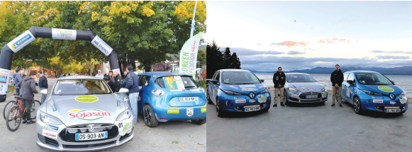 Llegaron dos Renault Zoe, un Tesla, una moto Zero y dos bicicletas con pedaleo asistido Matra. Cerraba el equipo de vehículos eléctricos una moto Electric Motion de trial, que no competía, sino que se utilizaba para los espectáculos acrobáticos que el campeón francés y piloto de la Zero ofreció en casi todas las ciudades en las que paramos. Un automóvil de combustión interna transportaba al equipo de periodistas, y cerraba la caravana una camioneta con un tráiler y finalmente una casa rodante.