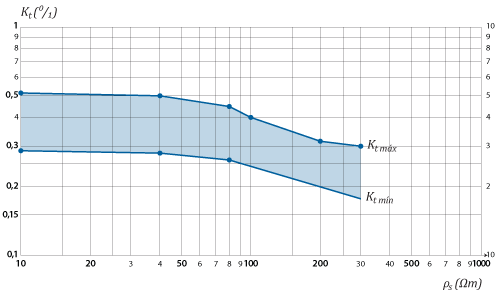 en sus valores máximos Ktmax y mínimos Ktmin correspondientes al mismo valor de la resistividad eléctrica volumétrica del suelo ρ(Ωm) donde está colocado el electrodo. Se tomó el ejemplo de un gel reductor de resistividad. Se puede apreciar que Kt disminuye cuando la resistividad aumenta y que se verifica que Ktmin ≤ Kt ≤ Ktmax