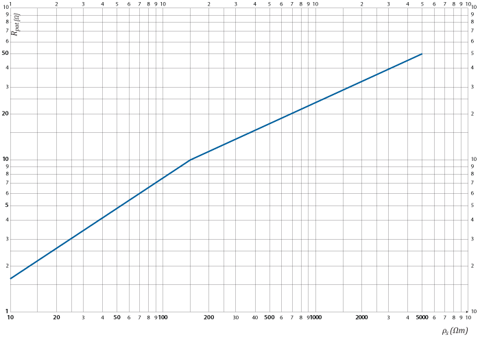 En la figura 3 se representa la curva de la resistencia de puesta a tierra para jabalinas electroquímicas de 63 milímetros de diámetro exterior y largos de 1.500 milímetros verticales, medidas luego de su instalación en función de la resistividad ρ(Ωm) promedio a tres metros de profundidad.