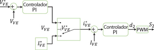 La carga de las baterías de vehículo eléctrico se realiza según el perfil de carga detallado en la sección “Sistema propuesto”, cuyo diagrama en bloques se muestra en la figura 8. Este consta de un lazo de control para la corriente y otro para la tensión, además, hay un bloque comparador que se encarga de ejecutar una u otra acción de control dependiendo de las condiciones del sistema [10] [13].