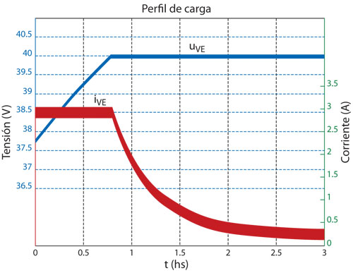 La figura 10 muestra el perfil de carga utilizado en el sistema. Se observa que, al iniciar el proceso de carga, la corriente se mantiene constante y en el valor de referencia de tres amperes (3 A), mientras que la tensión crece hasta alcanzar el valor de tensión de cuarenta volts (40 V). En este punto, el control conmuta y pasa a control de tensión, donde la corriente comienza a decrecer paulatinamente mientras que la tensión se mantiene constante en un valor de referencia.