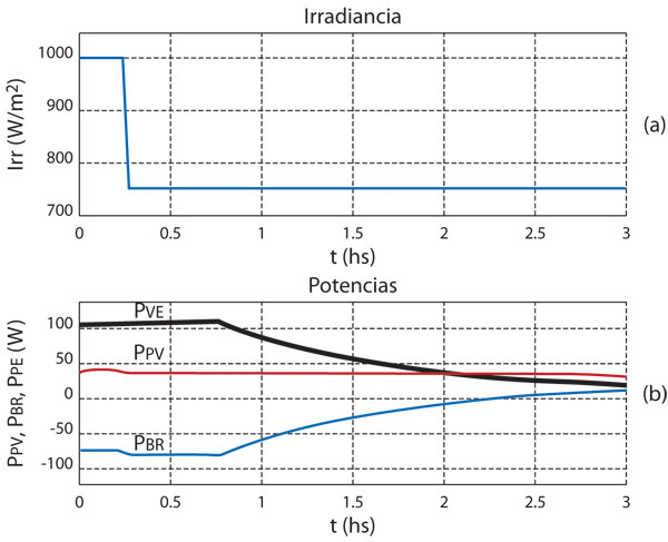 Tabla 3. Características del convertidor Buck En la figura 11 se muestran las potencias desarrolladas en el sistema durante el proceso de carga cuando ocurre un cambio de la irradiancia sobre el panel fotovoltaico. En la figura 11a, a las 0,5 horas se presenta un cambio en la irradiancia de mil watts (1.000 W) por metro cuadrado a 750. En ese instante, la potencia desarrollada por el panel fotovoltaico disminuye y la potencia entregada por la batería de respaldo aumenta, compensando el faltante de potencia y continuando con la carga del banco de baterías del vehículo eléctrico, lo cual se muestra en la figura 11b.