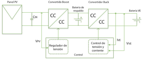 El sistema propuesto como estación de carga de pequeños vehículos eléctricos se muestra en la figura 2. Está compuesto por un panel fotovoltaico, un convertidor corriente continua-corriente continua (CC-CC) tipo Boost y un convertidor CC-CC tipo Buck. Se adiciona al sistema, como elemento almacenador de energía, un banco de baterías de respaldo conectado a la barra de CC. El control del sistema realiza dos funciones: por un lado, mantiene la tensión en bornes del banco de baterías de respaldo [10], y por otro realiza el perfil de carga predeterminado sobre el banco de baterías del vehículo eléctrico [11].