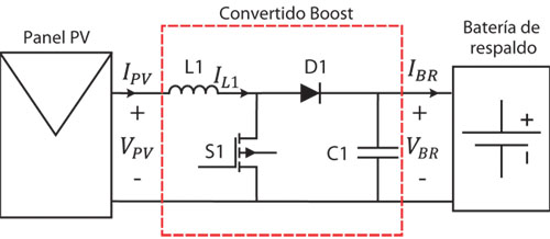 Con el objetivo de regular la tensión en bornes sobre un banco de baterías de respaldo de 48 volts desde un panel fotovoltaico de tensión nominal de doce volts, se utiliza un convertidor CC-CC tipo Boost cuyo diagrama se muestra en la figura 5.