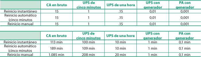 La ventaja clara del UPS es la eliminación de eventos de cortes del suministro eléctrico. La cantidad de eventos de cortes del suministro eléctrico se reduce cuando el UPS se instala independiente del comportamiento de los equipos o el nivel de servicio, como se muestra en la tabla 2 (PA = N+1 UPS tolerante a fallos como APC Symmetra Power Array).