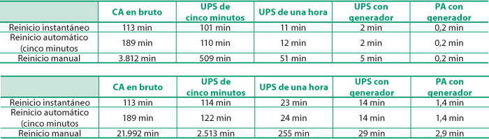 Tabla 5. Efecto del sistema UPS en el tiempo de inactividad del sistema: nivel de servicio remoto (abajo)