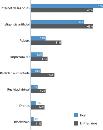 Le siguen en el ranking el uso de software y aplicaciones, la computación en la nube, los sistemas ciberfísicos, los mundos inteligentes, las aplicaciones móviles y, por último, el big data (datos masivos) y analítica avanzada.