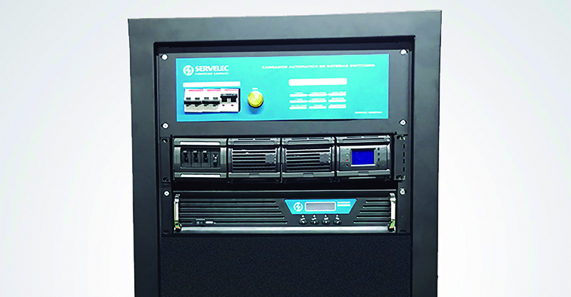 Sistema de energía de reserva ‘switching’ rackeable, de Servelec: cargador de baterías, inversor y banco de baterías incorporados en un único rack.