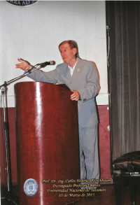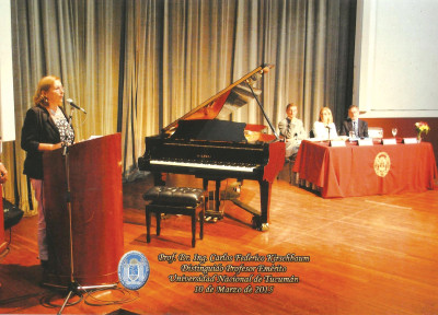 En cuanto a extensión, expresó Colombo que “También encontró tiempo en su agenda para coordinar un proyecto para el desarrollo de áreas rurales de Tucumán con grupos de la facultades de Ciencias Exactas y Tecnológica (FACET) y Arquitectura y Urbanismo (FAU), y trabajar además en la comuna rural El Puestito con un proyecto de desarrollo local, articulándolo con el trabajo académico, dirigiendo una tesis doctoral sobre arquitectura sustentable para pequeños productores rurales. También impulsó la participación de todos nosotros en organizaciones nacionales e internacionales como CIE, CLA, lRAM, AADL, AFA, SABI, ASADES, etc. ” Para finalizar se refirió a sus características personales: “Su inteligencia particular consiste en articular su mirada allá a lo lejos, vislumbrando siempre nuevos escenarios y nuevos proyectos, con una mirada del detalle que a veces es tan importante como tener un lugar de trabajo confortable y espacios para que los estudiantes puedan quedarse a estudiar en la facultad. A su vez, con una mirada interdisciplinaria del campo de la ciencias de la luminotecnia que permitió considerar al usuario en la propuesta de las ciencias de la luz y la visión”. Destacó asimismo “Su capacidad de trabajo, de gestión, de relacionar, de buscar, de resolver, de identificar áreas de vacancias, de planificar, pero por sobre todo, de incluir siempre un mecanismo de evaluación que nos ayude a crecer bien, a no conformarnos, sino a buscar mejorar siempre, desde la mirada externa, que no tiene compromisos con lo que hacemos y puede tener mayor independencia”. Pero por sobre todas las cosas “Fue muy generoso para con todos nosotros, fomentó nuestra participación en todo tipo de actividad y proyectos, con altas exigencias, incluyendo capacitación, invitando capacitadores externos, armando equipos de trabajo”. La Dra. Colombo concluyó: “Como he querido expresar en esta apretada síntesis, la UNT puede estar orgullosa de este docente investigador, de este profesor titular, de este formador de formadores, que hace honor a la frase que identifica a nuestra querida universidad: Pedes in terra ad sidera visus, así ha sido la trayectoria de Carlos Kirschbaum, con sus pies bien fijos en su Tucumán y en su región, pero siempre con una mirada hacia los cambios y hacia los nuevos escenarios”. La ceremonia concluyó con las palabras del homenajeado, quien agradeció a autoridades y colegas por el otorgamiento de la distinción, la presencia de amigos, familiares, estudiantes, personal de la UNT y el CONICET e investigadores. Agregó comentarios que amplían, a su criterio, el significado del curriculum vitae con anécdotas, experiencias y vivencias referidas a su vida familiar, a los periodos dedicados a su formación en la escuela primaria, secundaria y universitaria, como también en diversos ámbitos que posibilitaron definir la orientación vocacional enriqueciendo su cultura y posición frente la vida y la sociedad. Entre otros, destacó su militancia en el movimiento estudiantil, su participación en discusiones y debates en el tradicional café “La Cosechera” en San Miguel de Tucumán, sus trabajos como diseñador de iluminación teatral y de televisión. Destacó el periodo de casi seis años en el exterior, en Copenhague y Berlín, en donde convivieron los sabores amargos del exilio con los excitantes de nuevos contextos culturales y académicos, lo que consolidó su formación personal y profesional dotándolo de muchas herramientas que utilizó a su regreso al país, a Tucumán. En el libro de reflexiones habilitado para estas ceremonias escribió: “Me siento honrado y emocionado por la distinción que me otorga la Universidad Nacional de Tucumán, que además me da trabajo y permite que haga lo que me gusta”. |