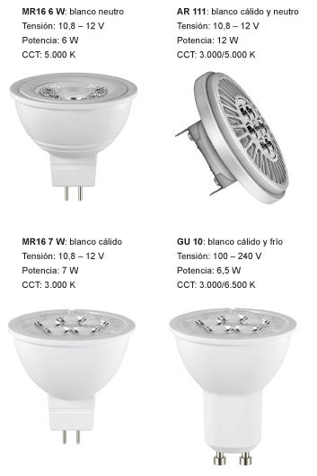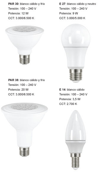 Con diferentes formas de conexión y casquillos, se presentan en tonos blancos que van desde el neutro hasta el cálido y el frío, con temperaturas de color de 2.700, 3.000, 5.000 o 6.500 K. Se caracterizan por una larga duración y un bajo consumo de energía, ya que por un lado son lámparas a base de iluminación led, pero además, sus equipos disipadores logran del led su mejor potencial.