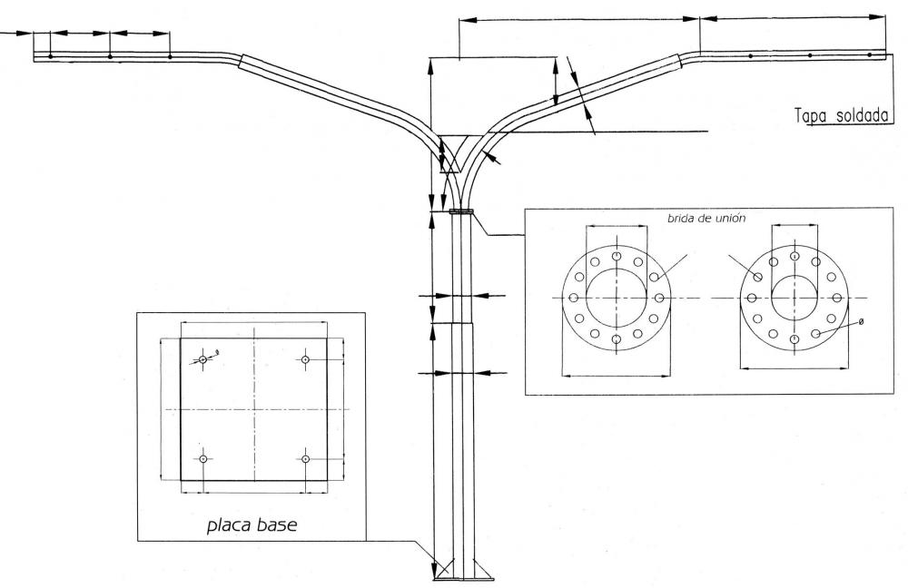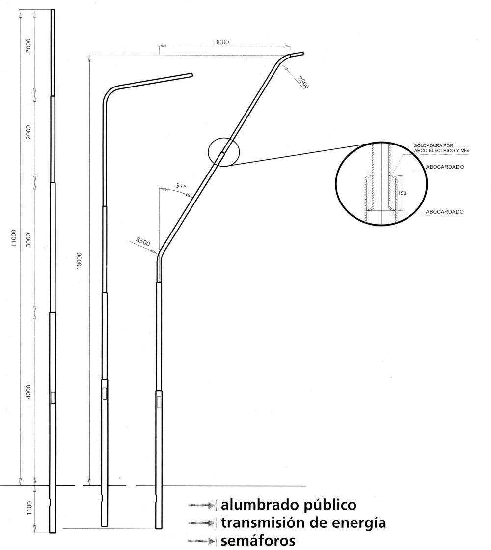 Las columnas para el alumbrado de la firma Dismet, más conocidas por el nombre de su marca, Cayca, están construidas con caños de acero en tramos de distintos diámetros, según su diseño y requerimiento, con brazos curvos, rectos, simples, dobles, múltiples, fijos, desmontables, según pedido. Se caracterizan por su sistema de unión entre caños: a los mismos se les realiza un abocardado en cierre y otro en forma de copa en cada extremo por lo que, luego de ejecutada la soldadura de unión por sistema MIG, es posible un empotramiento perfecto, sin necesidad de cuñas ni botones de soldaduras. Esta característica confiere a las columnas una resistencia estructural inmejorable, y garantiza una larga vida útil. La división de columnas para alumbrado se presenta en tres subdivisiones: