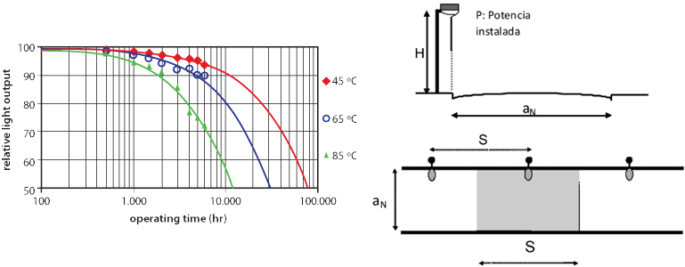 Tomando la figura 1, y como dato adicional, la vida y depreciación del led dependen fuertemente de la temperatura de juntura dentro de la luminaria real, también difícil de estimar, por lo que el desempeño de las instalaciones actuales darán datos valederos recién en un par de años.