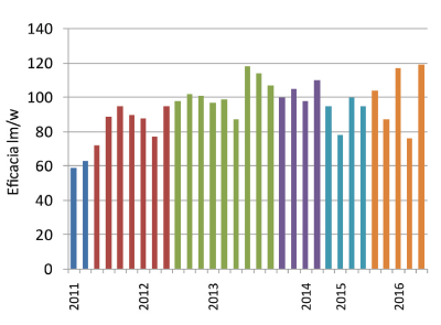 Si bien la figura 3 muestra una tendencia creciente para la eficacia de las luminarias leds para el periodo 2011-2014, se observa una cierta estabilidad actual, con valores entre noventa y casi 120 lúmenes por watt.