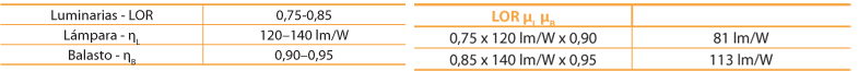 En (1), μu es el rendimiento de la luminaria en la instalación (relación entre flujo luminoso útil y flujo emitido por la luminaria); Qo, el coeficiente de luminancia media; LOR es el rendimiento de la luminaria, ηL es la eficacia de la lámpara; ηB es el rendimiento del balasto, y PLum, la potencia de la luminaria.