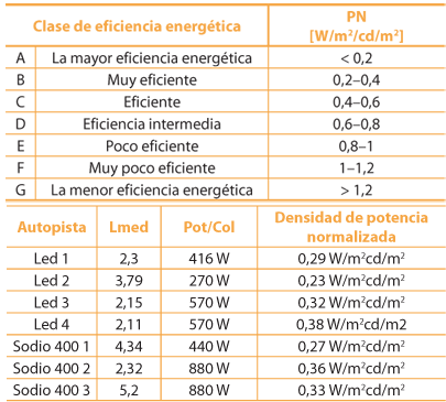 En la tabla 6, se muestran potencias normalizadas obtenidas a partir de evaluaciones de luminancias en las autopistas de ingreso y urbanas de la ciudad de Buenos Aires ya citadas.