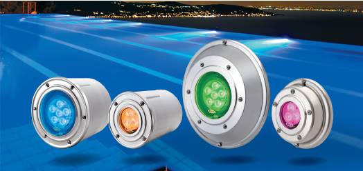 Laguna 50, luminaria subacuática para usar con lámpara bipín doce volts, cincuenta watts, con plaqueta aisladas de leds RGB o monocolor