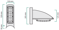 Medidas aproximadas El diseño compacto se potencia con la robustez habitual de las luminarias Strand, pues su carcasa monolítica está construida en una sola pieza de aleación de aluminio, fabricación que también corresponde al marco portatulipa frontal que proporciona una resistencia extraordinaria a las tormentas y granizadas más severas. En particular, se debe considerar que la tulipa se elabora con un policarbonato antivandálico que se complementa con la forma superior policurva de la luminaria que dificulta su aprehensión. Dicho de otra forma, la superficie policurva superior impide que se cuelgue con sogas, y la ausencia de tornillos exteriores dificulta su hurto. El lector debe tomar en cuenta que por su baja potencia (treinta, veinte o cien watts) la mayoría de estas luminarias serán instaladas a baja altura, en muchos casos, al alcance de la mano. En todo momento se mantiene un cerramiento en el recinto óptico correspondiente a la clasificación IP 66. Tanta prestación sorprende en una luminaria particularmente pequeña.