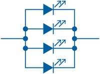En la conexión en paralelo, todos los leds están sometidos a la misma tensión, pero la corriente que necesitan se multiplica por la cantidad de ellos en paralelo. Por ejemplo, con un led de 350 miliamperes y 3,5 volts, el circuito de la figura 3 requeriría un driver de 1.400 miliamperes y que pueda dar por lo menos 3,5 volts.